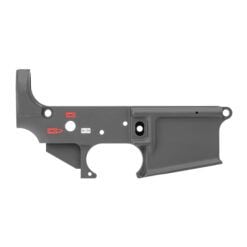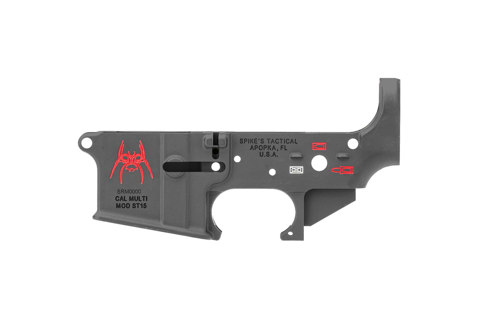 Spike’s Tactical lower is American-made to the highest standards. Forged from 7075 T6 aluminum, it supports a black hard-coat anodized finish, multi-caliber, low shelf, and is RDIAS compatible. This model has an ST Spider logo with red coloring.